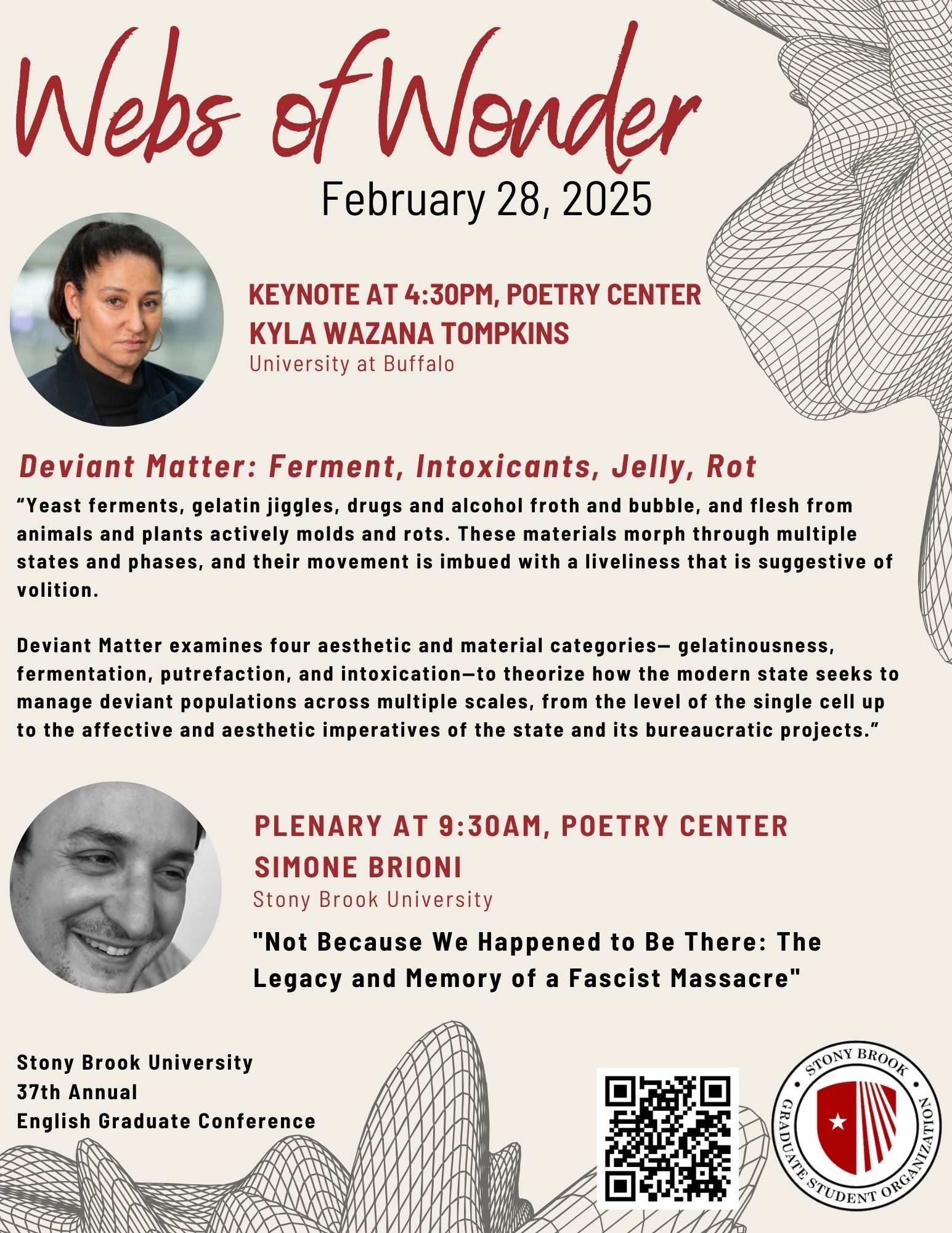 This conference welcomes projects that engage with conceptions of webs and wonder, including interdisciplinary studies of networks, matrices, and patterns across media. Other projects may cover mobility and movement (environmental, national, physical, virtual reality– who and what can be moved) or historical studies of and/or representations of urban development and migration. Additionally, wonder as a cognitive or emotional response and wonder as physical and tangible objects of connectivity are also appreciated. We further invite studies of genre/style, sequels/prequels, disciplines/fields, and/or canons, the life of a text or object/circulation of knowledge, work on the archive, the whisper network, or #MeToo movement.