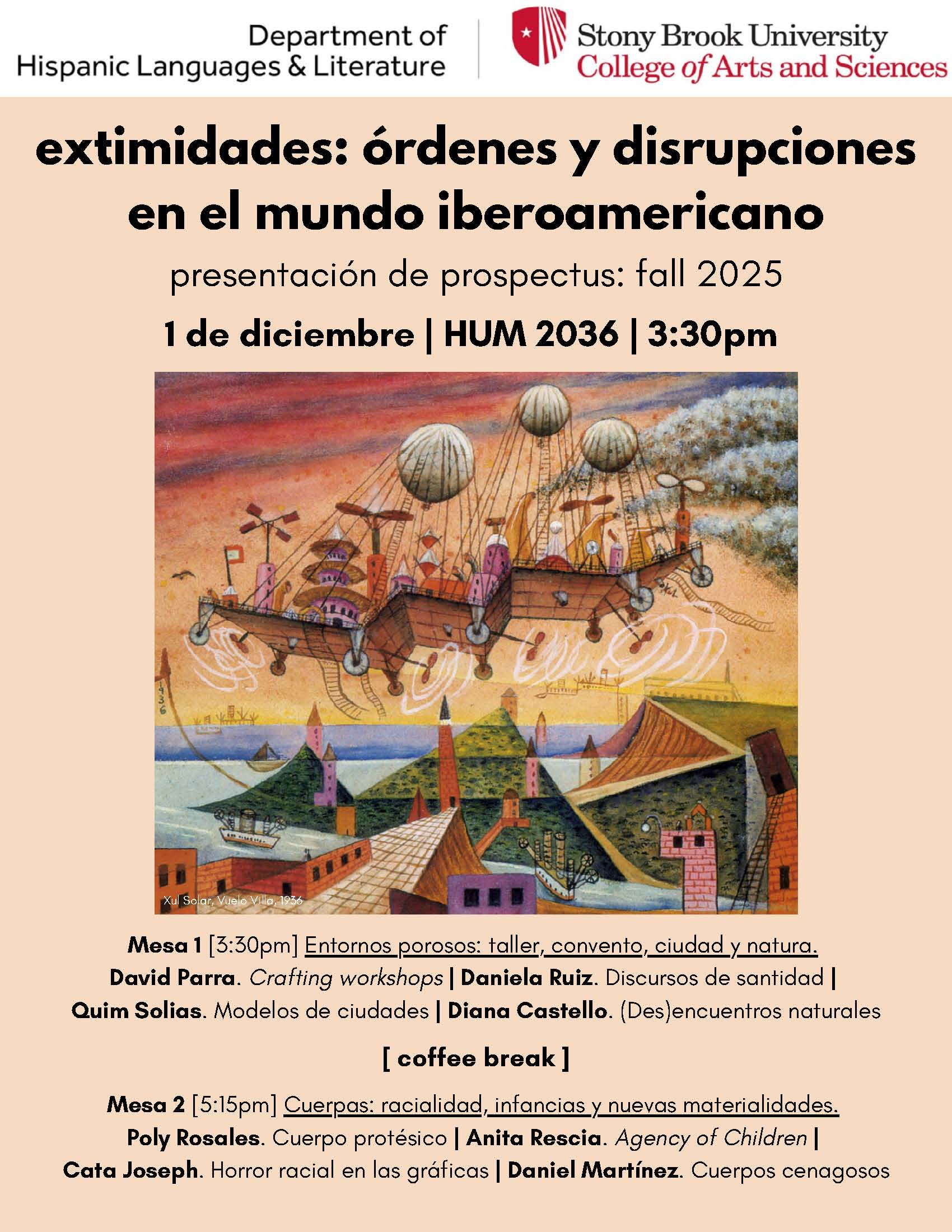 April 16 Round table I: "Politics and Languages in Latin American Colonialism" with Professors Antonio Feros, José del Valle and visual artist Daniela Ortiz de Zevallos. LACS Grad Student Led Series, organized by HLL PhD students Henrry Ibáñez, Quim Solias and Daniela Ruiz. Wed April 16th, 12.30 to 1.50 pm in HUM 2036 (in-person). Register here for Zoom. See poster and webpage for more information.