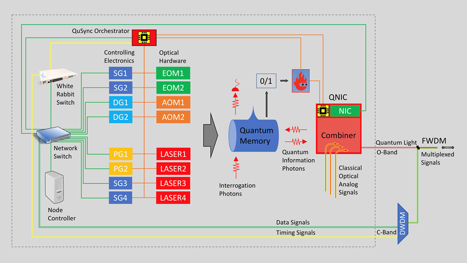 Schematic of the internal network of a quantum node containing a configurable quantum memory. The intranode network includes a software-defined node controller, classical switch, a White Rabbit timing switch, an orchestrator (device trigger controller) and a QNIC. The controlling electronics are connected to the classical network for configuration, management, and monitoring and are driven by the orchestration which is synchronized with the rest of the network through the timing switch. The QNIC electronics interface with the electronics of the photon source and the orchestrator, while the two outputs of the photon source are connected to the optical combiner part of the QNIC where quantum signals are combined with classical optical analog signals that need to co-propagate with the quantum signals in the same band (O-band). The (classical) NIC part of the QNIC is also connected to the classical switch for control communications. The node has 4 optical connections to the world, one for data, one for timing, and two for quantum signals. The signals can be further multiplexed and routed to other nodes using optical switches.